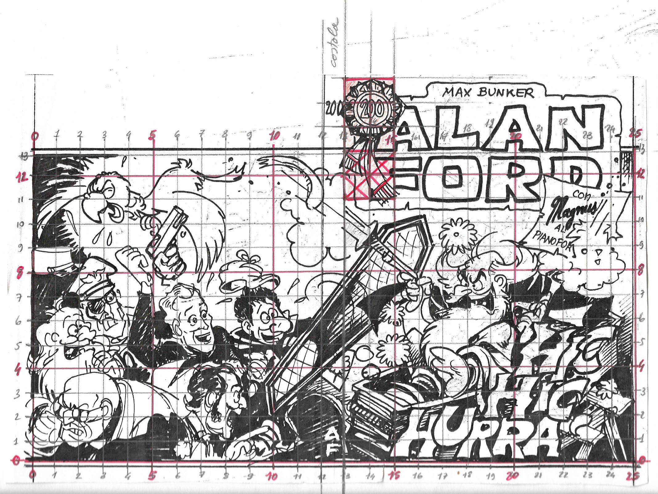 Esclusivo: Layout del disegno copertina ALAN FORD n.200: fotocopia del nero incollata su cartoncino con schema originale disegnato da Magnus